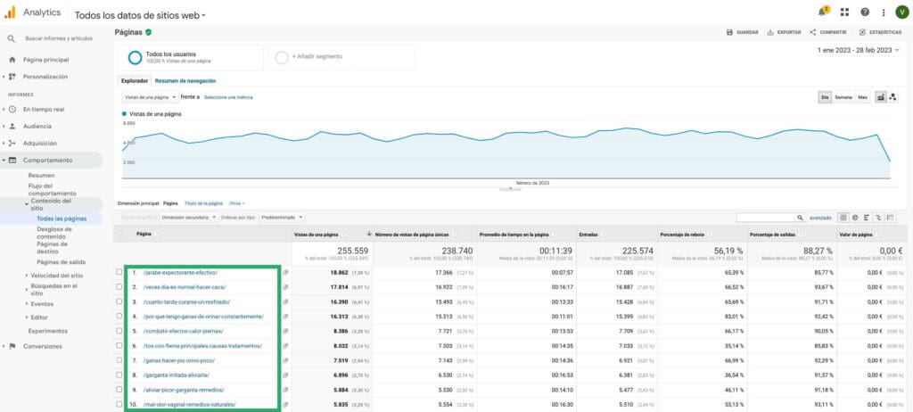 - Para ver qué páginas están siendo visitadas en tu blog, haz clic en «Comportamiento» y luego en «Contenido del sitio» y después en «Todas las páginas». Esto te mostrará una lista de las páginas más vistas en tu sitio web, así como la cantidad de tiempo que los visitantes pasan en cada página.